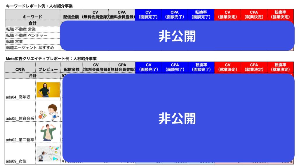 より深い地点のキャッシュポイント(ジム入会、転職決定、サービス契約、初回施術完了 etc…)まで広告データと連携し、ダッシュボードを構築。