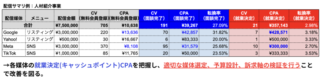 →媒体別、キーワード別、クリエイティブ別の成約CPAを算出し、適切な予算設計、訴求軸の検証を行うことが可能。