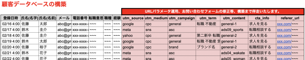 「顧客データベース」の構築・修正、「広告URLパラメータ」の運用、広告データ突合反映につきましても伴走いたします。