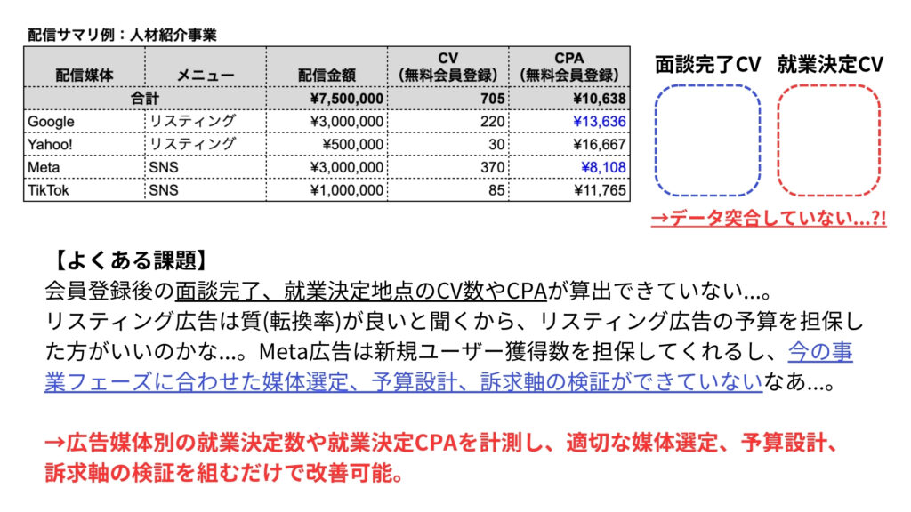 →媒体別、キーワード別、クリエイティブ別の成約CPAを見失い、誤った予算設計や訴求軸の構築を行う可能性が高く、売上対広告比率の苦戦要因となり得る。